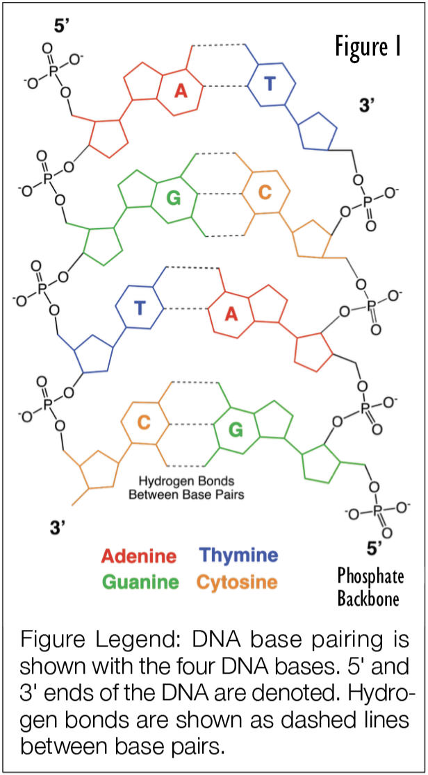 The major information storage molecule in our cells is DNA or deoxyribonucleic acid. It should be noted that information appears also to be stored in other ways than the DNA sequence alone (e.g., epigenetics, spatial information, and other forms). DNA is a double-stranded polymer of nucleotide bases—we call them A, T, C, and G for short (see Figure 1). These bases are arranged in sequences (e.g., like letters combining to form words and sentences) that encode information about building proteins and for controlling how and when portions of the DNA are used. Interestingly, only about 2% of the human genome encodes proteins. Yet, the ENCODE project demonstrated in 2012 that 80%+ of the human genome has biochemical function, which implies that there are many other functions for DNA other than encoding proteins.2